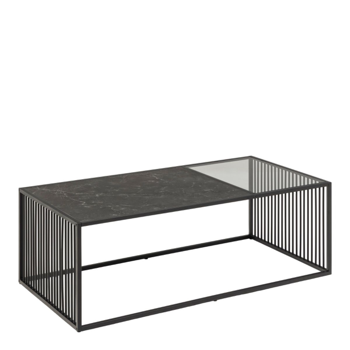 Explore the Strington range, where modern elegance meets robust functionality. Stability is guaranteed by sturdy metal frames, ensuring durability and reliability. The collection features a captivating black marble look and tempered, smoked glass.