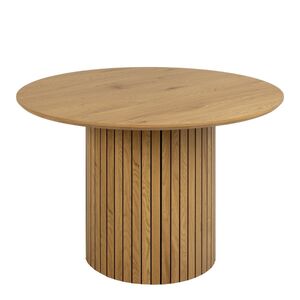 Immerse yourself in the rustic yet refined charm of our round dining table or coffee table, featuring a textured matt wild oak effect top and pillar base. The intricate lamella front design adds a sophisticated touch, making it an exquisite centerpiece for any room.