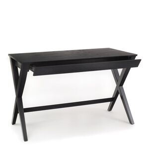 Optimize your workspace with this sleek office desk, featuring a black lacquered oak veneer top and drawer. The distinctive cross base, finished in black lacquered rubberwood, adds a modern twist, while the metal runners and wire hole incorporate functionality for a clean and efficient work environment.