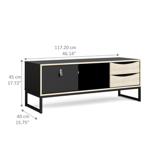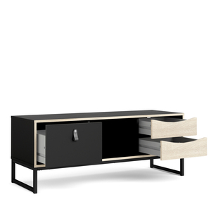 Stylish Matt Black Oak TV Unit with 2 Spacious Drawers & Open Shelf, Metal Framework Design